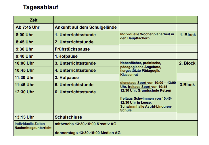Die SchülerInnen starten zunächst mit einer geringen Stundenanzahl pro Tag, häufig werden sie vorerst mit zwei Schulstunden beschult. Schrittweise wird die Stundenzahl (je nach Klassenstufe und Entwicklung) bis auf sechs Schulstunden oder auch zusätzlichem Nachmittagsunterricht erhöht. Nach einer Eingewöhnungsphase dürfen die SchülerInnen am Sport- und Schwimmunterricht teilnehmen.